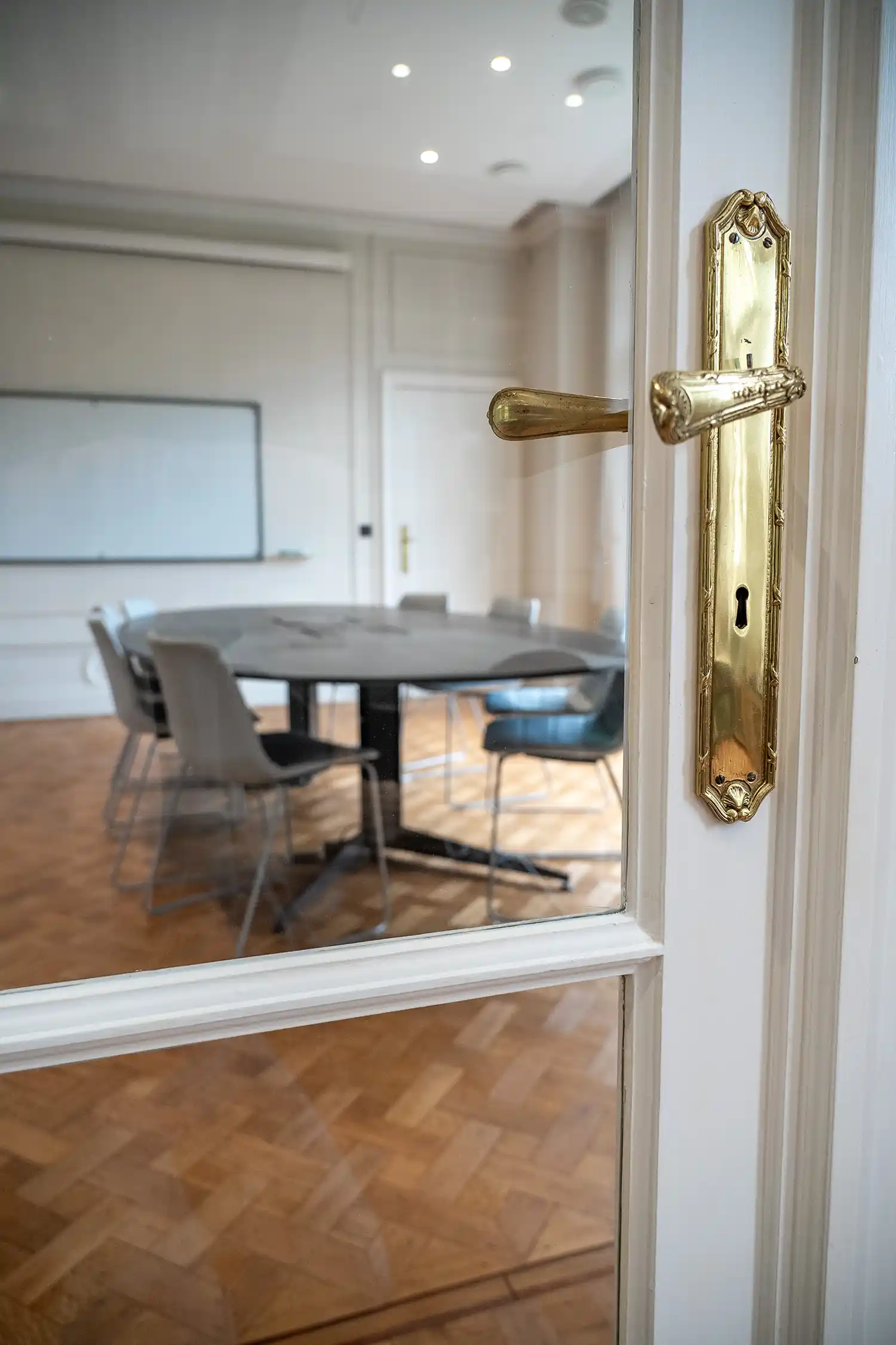 Trois hommes travaillent sur des ordinateurs portables autour d'une grande table blanche dans une salle lumineuse avec des fenêtres et des étagères en bois.